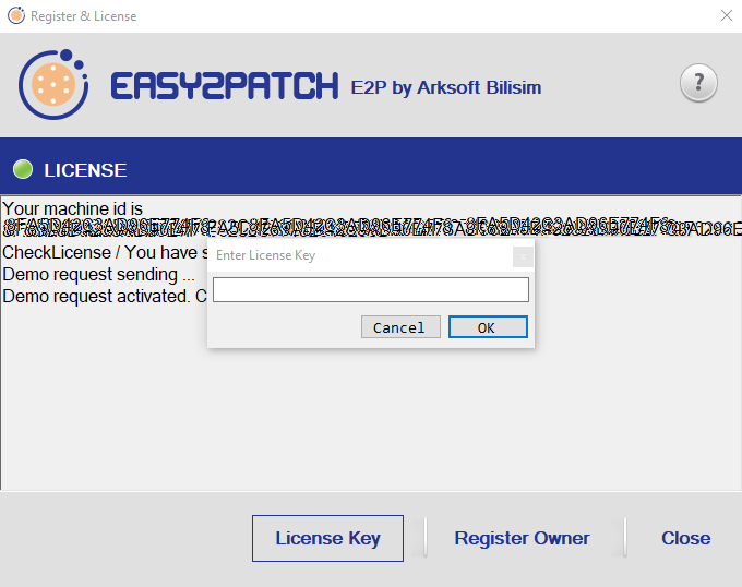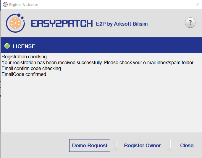 7. After this process, the **Demo Request** button will be activated. When you press this button, an inactive demo license will be created for you. The product key for this license will be contacted by the Easy2Patch team and sent to you via e-mail.