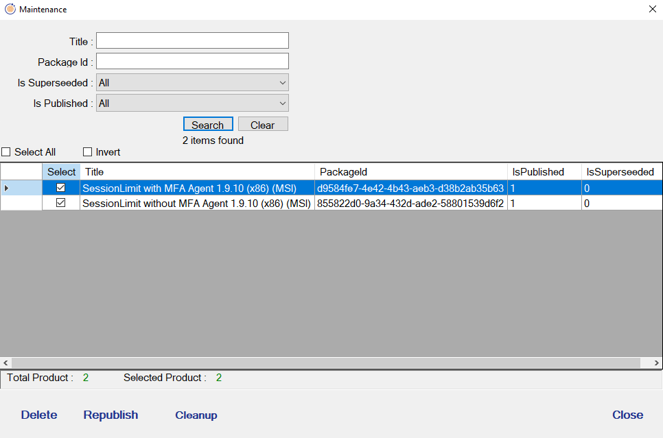 With the **Delete** button, the selected updates are deleted from WSUS. With **Republish** button, selected updates are republished to the WSUS system. With this option, selected updates are deleted from the WSUS system, and then published again. With **Cleanup** button, the cleanup function is run on the WSUS and the Superseded updates in the database are Declined and the Declined updates are deleted.